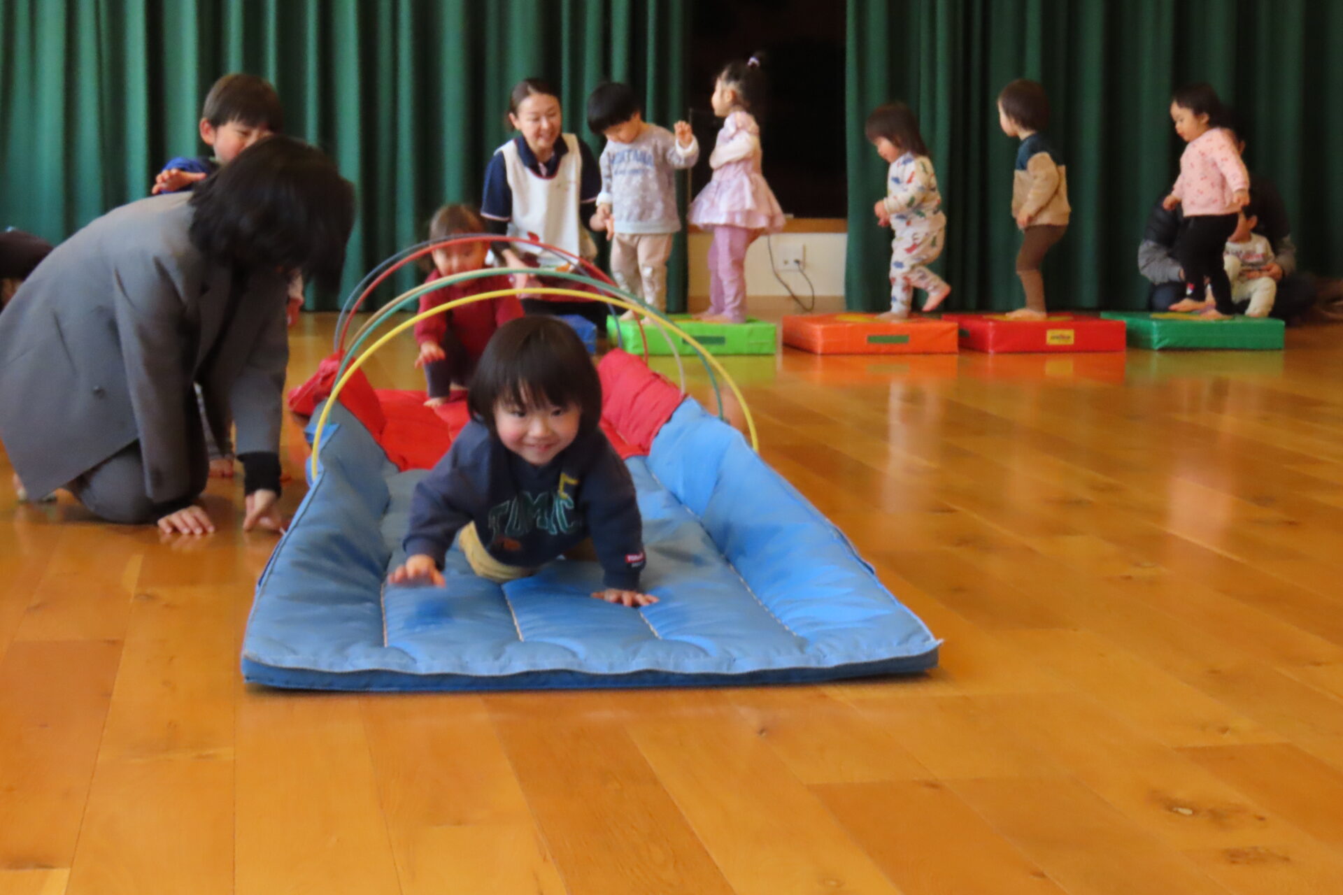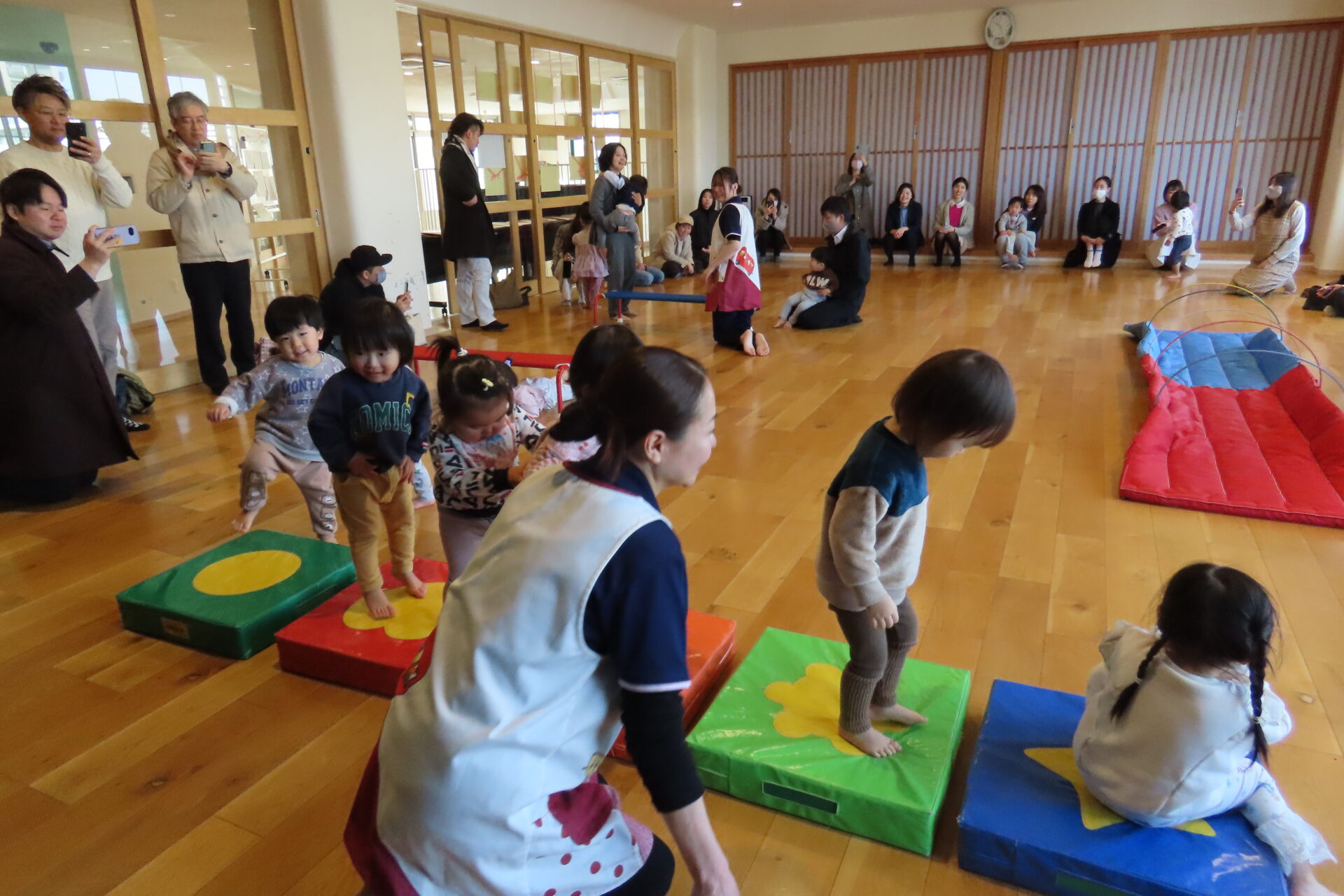 1月28日(水)保育参観では、はじめに「とんぼのめがね」を歌い身体を動かしました。その後、朝のお集まり歌や季節の手遊びや絵本の読み聞かせを済ませ、活動のサーキット遊びに入り色々な遊具を使い楽しく身体を動かしての保育参観となりました。