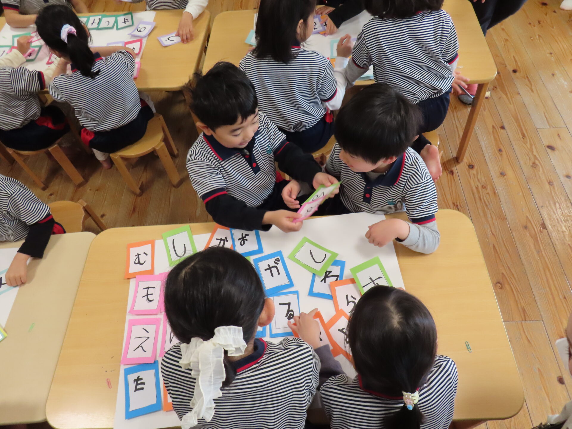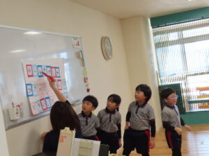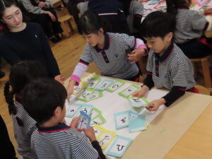 1月20日(火)かもめ組の保育参観がありました。自分の名前を書いたカードをグループのお友だちとシャッフルし、一つの文字をつなげて言葉を作っていきました。「か」「わ」のカードの文字をつなげて「これは、かわになるね!」などの友だちとの会話も広がり、見つけた言葉を保護者の前で発表しました。それぞれのグループで沢山の言葉を見つけることが出来ました。これからも楽しくひらがなに触れ、文字や言葉への興味や関心を深めていきたいと思います。