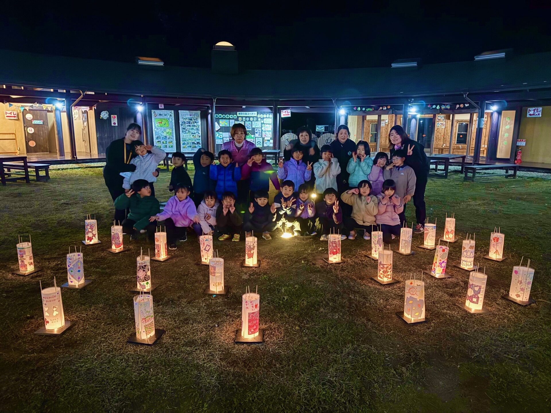 夜に自分の灯篭を持って、小学校で頑張りたいことをみんなの前で発表し、火の妖精と一緒に灯篭へ明かりを灯しました
