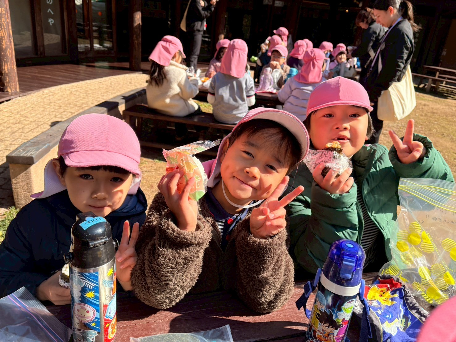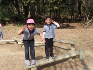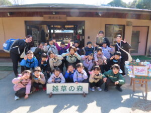 到着 竜田口駅で降りて歩いて雑草の森を目指し、急な坂道もみんなで「もう少しだよ!」「あとちょっと~頑張れ」と励まし合って登り全員無事到着。雑草の森について、おにぎりのお弁当を食べてパワーを溜めました。