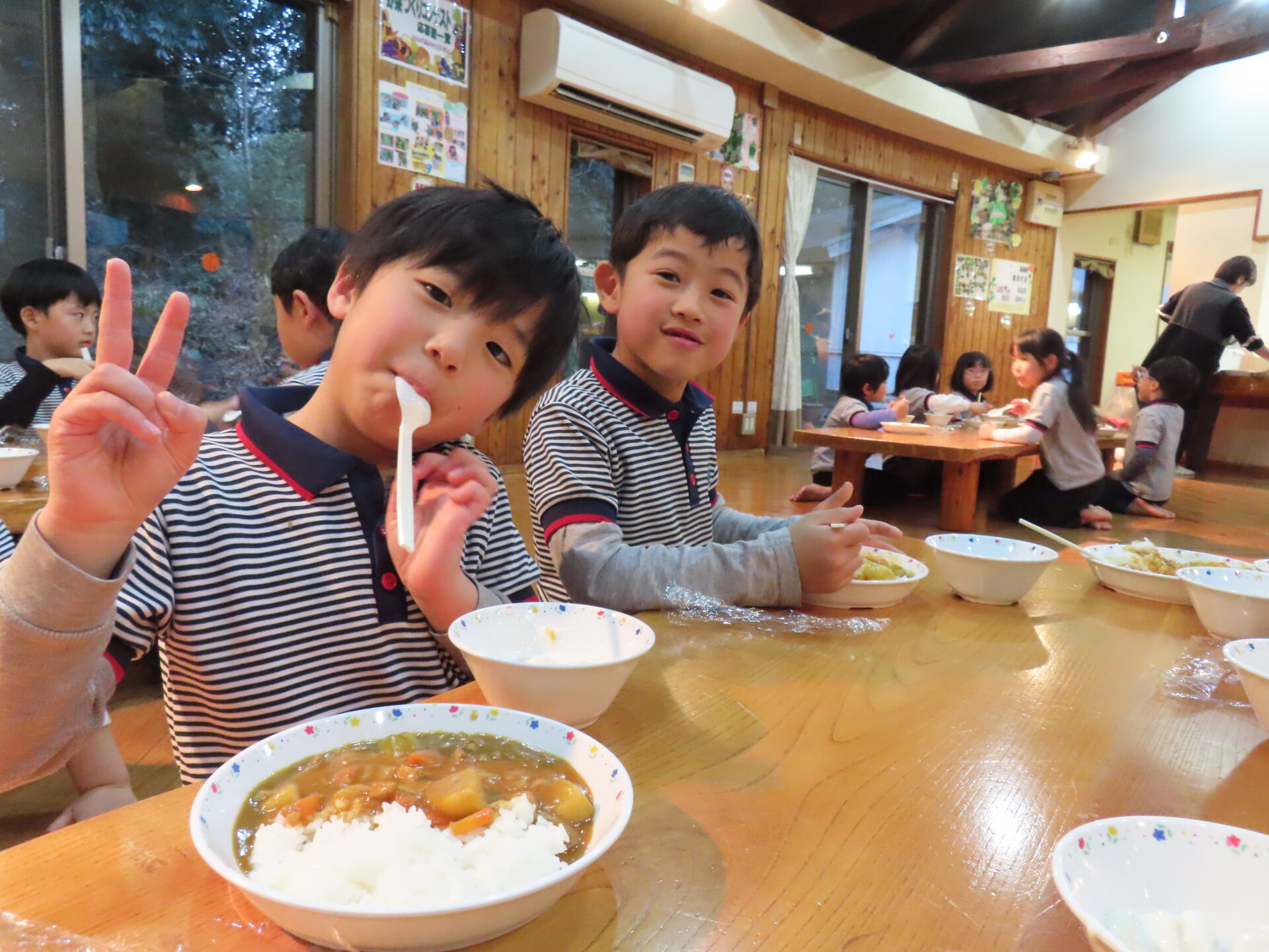 朝は体操をしたり、ホットドックを食べて「おいしいね~」と話し合っていました。