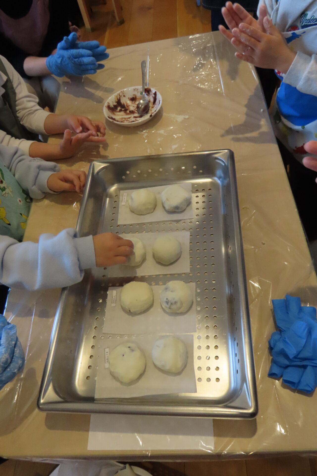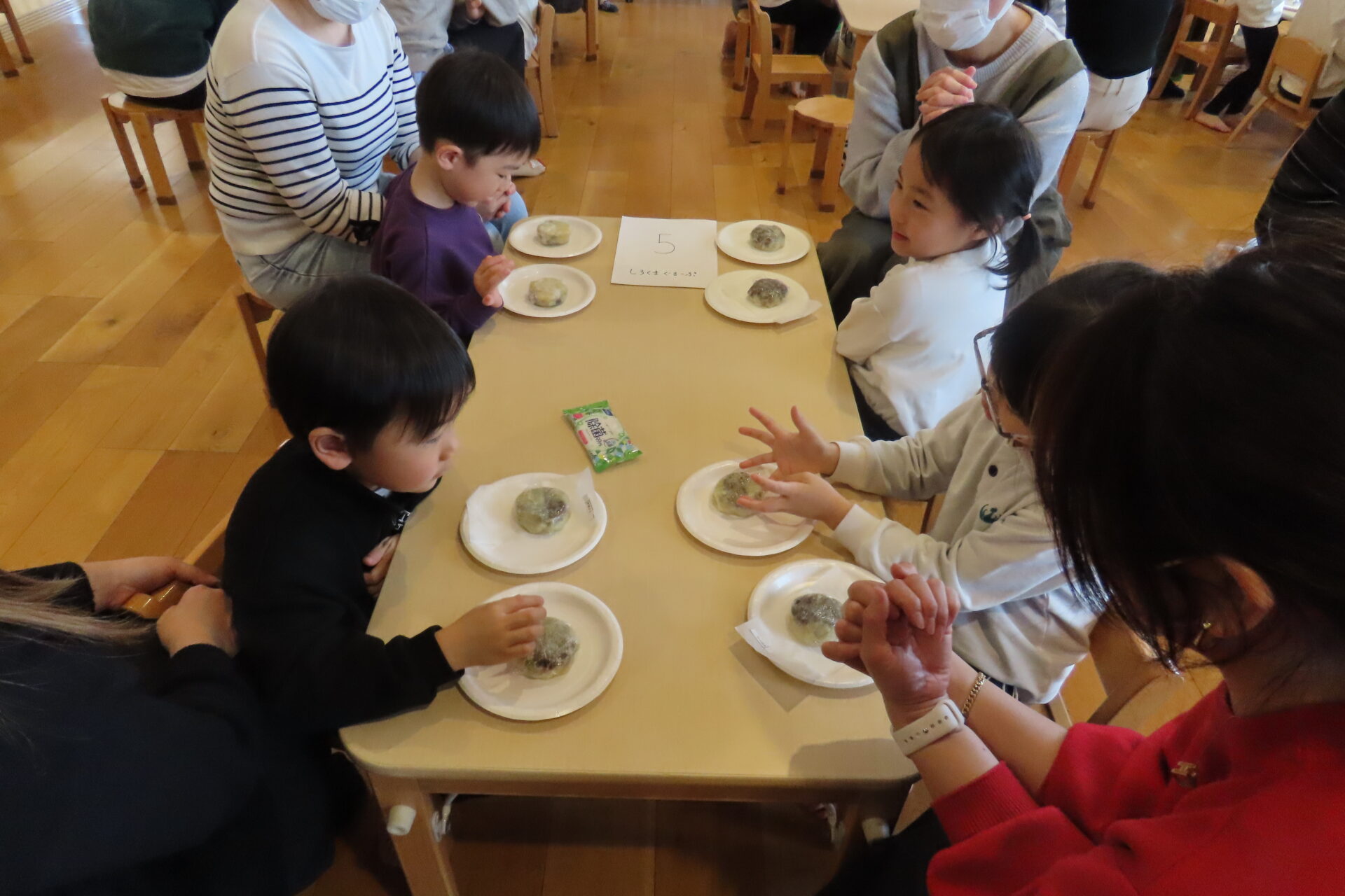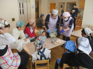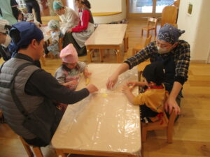 2月19日(木)親子で「いきなり団子づくり」を行いました。さつまいもを見たり触れたりしながら、生地で包む工程に挑戦し「こうかな?」「できたよ!」と、保護者の方と一緒に会話を楽しみながら取り組む姿が見られました。少し難しい場面もありましたが、手伝ってもらいながら最後まで作り上げることができ、子どもたちの嬉しそうな表情が印象的でした。蒸し上がると「いいにおい!」と笑顔があふれ、出来上がった団子を親子で美味しく味わいました。