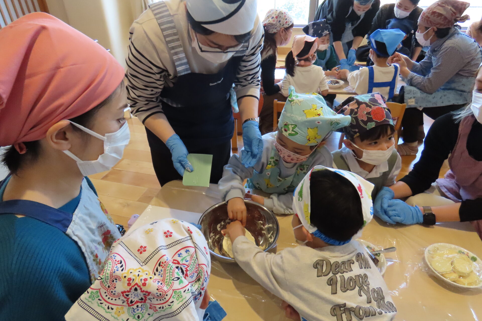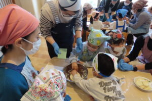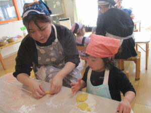 1月29日(木)親子にて、クッキー作りをしました。エプロン、三角巾を着用してランチルームへいつもと違う雰囲気にそわそわ・わくわく。こねたり、型抜きをしたり、一生懸命な姿がとても可愛くてほっこり。ランチルームからの甘い匂いに「もうクッキー焼けたかなぁ~」と出来上がりを楽しみにしていました。出来上がったクッキーをみて「わあ!おいしそうー」と大喜び。クッキーを親子で美味しくたべて笑顔あふれる時間になりました。