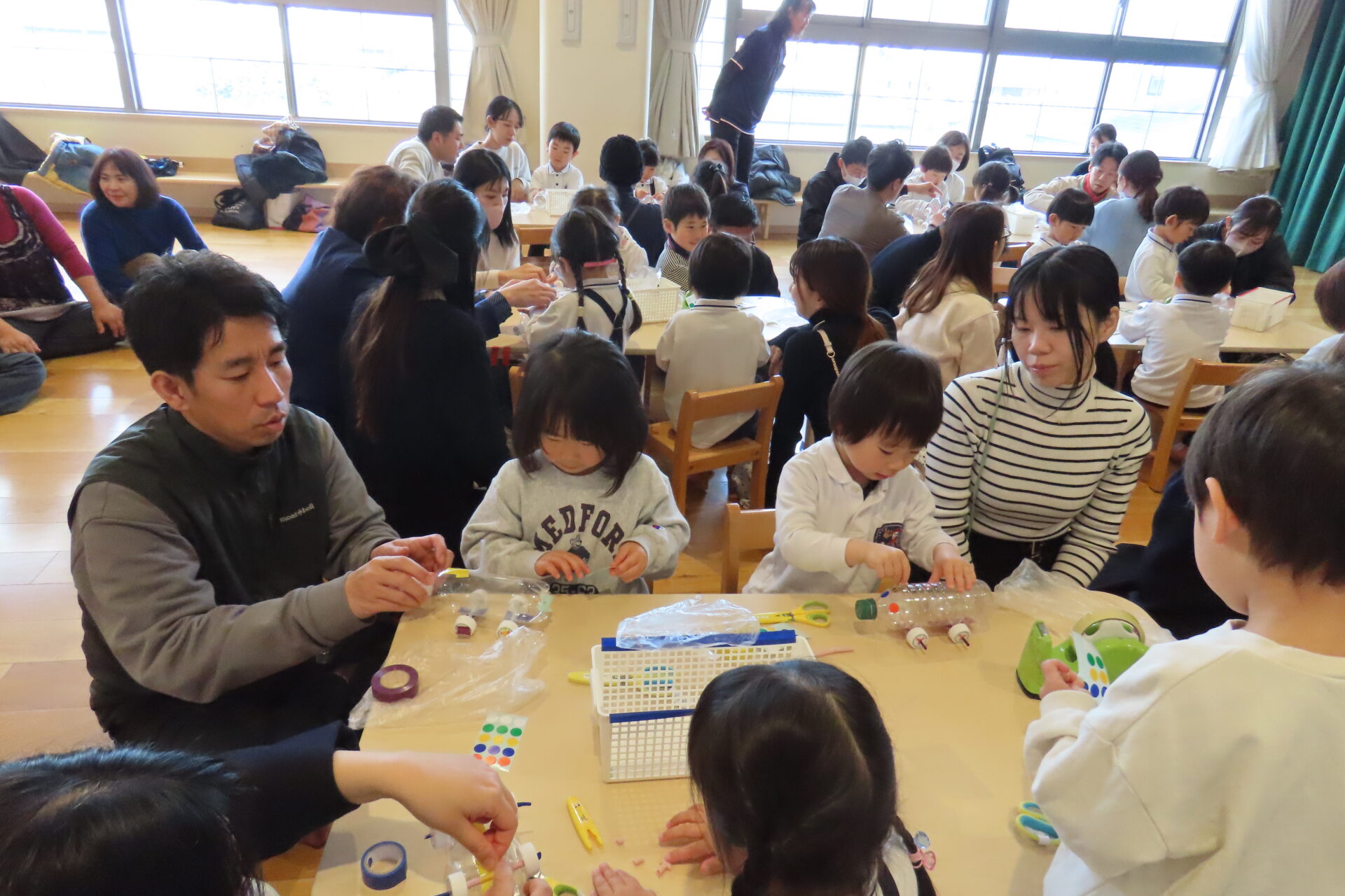 2月12日(木)保育参観がありました。今回は親子でペットボトルの車を作りに挑戦「かっこいい車がいいな!」「ハートを付けて可愛くしたい!」等親子で一生懸命取り組む姿はとても微笑ましかったです。できあがった車をみんなで走らせ楽しい時間を過ごしました。