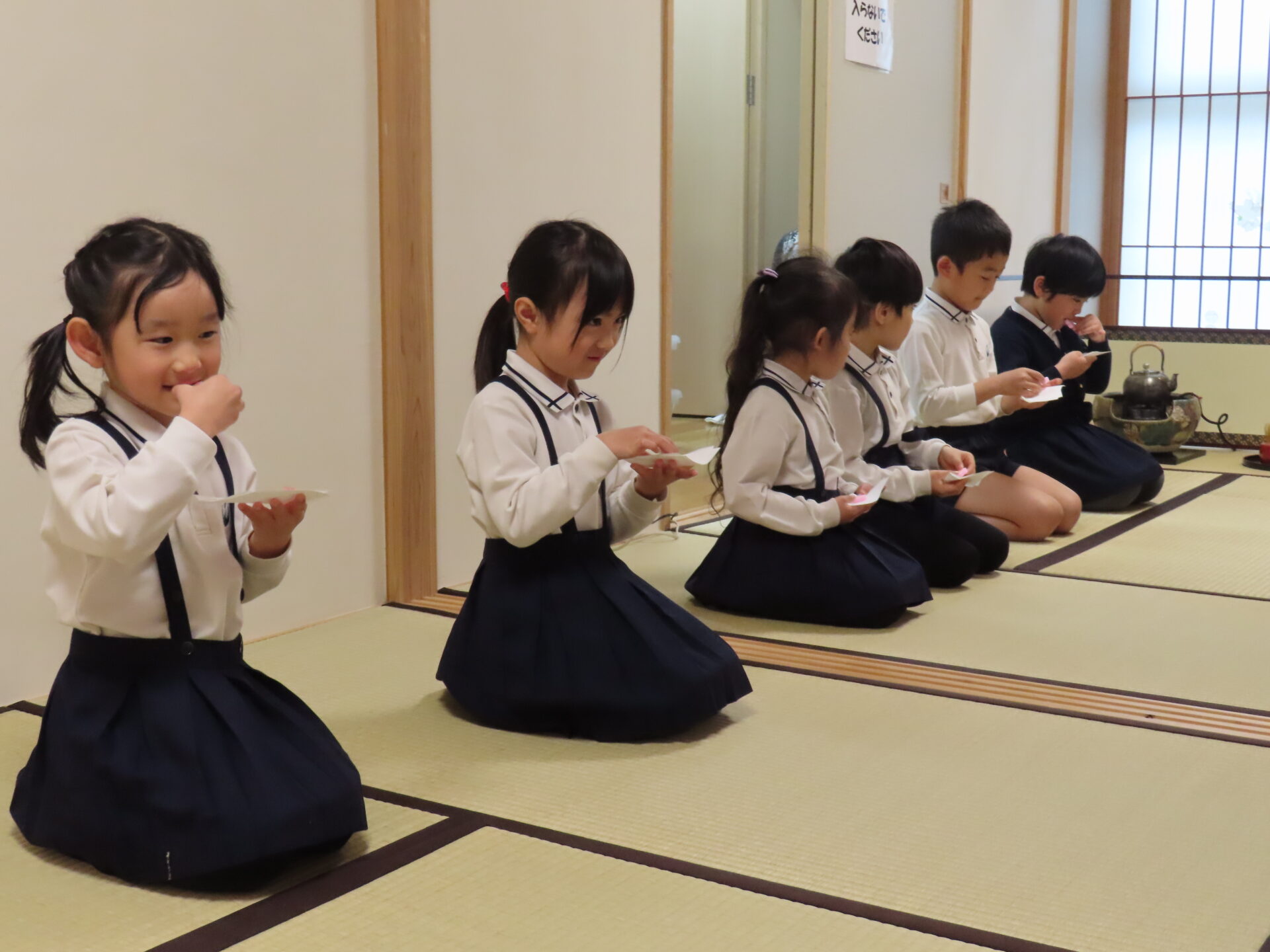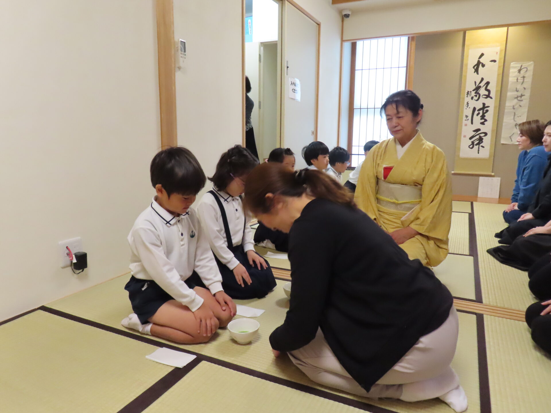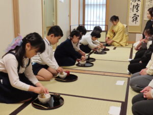 3月2日(月)に親子おさらい会がありました。一年間茶道を学んで、今日は、保護者の方に日頃の茶道の様子を見て頂きました。初めのころはお茶をたてることに難しさを感じ「うーん、なかなか出来ないなぁ」と言う子どもたちもいましたが、会を重ねるにつれて段々とお茶をたてることが上手になってきました。自分でたてたお茶をおうちの方に「どうぞ」と伝えさし出し、たてたお茶を飲んでいただきました。保護者の方も「美味しいね」と和やかな時間を過ごすことが出来ました。茶道を通して日本の文化にふれる経験ができ素敵なおさらい会。保護者の方にも喜んでいただけました。