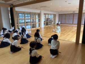 4月14日(火)に初めての謡いを行いました。謡いの先生から挨拶の仕方や扇の持ち方を教えていただきました。途中休憩を挟みながらも、正座の場面では姿勢を意識し、最後まで一生懸命頑張る姿が見られました。